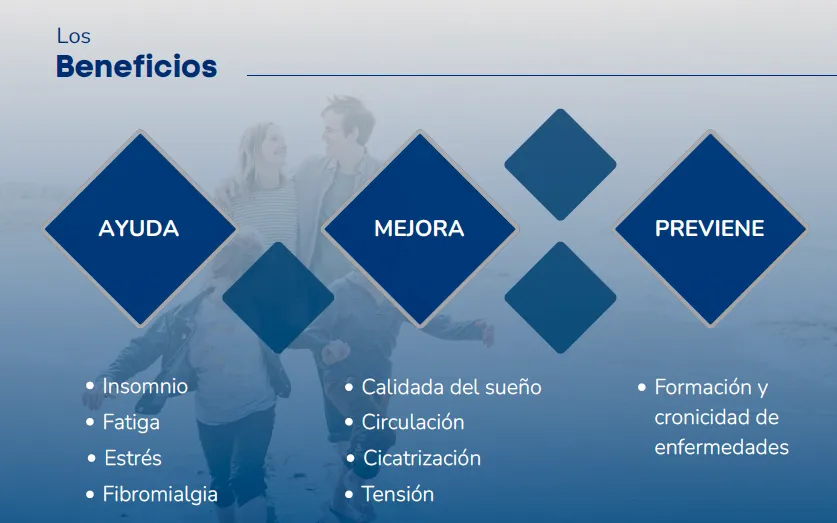 Utiliza energías, frecuencias específicas y campos magnéticos para estimular la regeneración celular, mejorar el sueño y aliviar el dolor crónico.